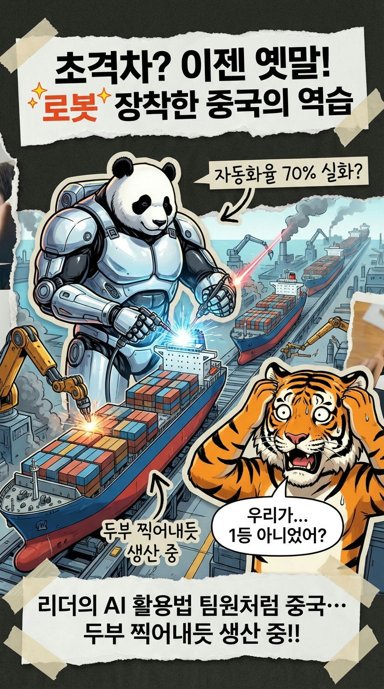 이렇게 쏟아져 나오는 배들, 결국 해운업 불황을 앞당길 겁니다. '설마' 했던 기술 격차는 이제 5% 가격 차이 앞에 무의미해졌어요. 중국은 이제 '인건비'가 아니라 '자동화'와 '로봇'이라는 새로운 무기를 장착했습니다. 이건 20년 전 우리가 일본을 따라잡던 그림이랑 똑같아요.